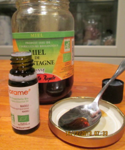Mon réflexe : 2 à 4 gouttes d’huile essentielle de niaouli bio (Melaleuca Quinquenervia, Florame chez Naturalie) à mélanger avec un peu de miel. Je prends un peu de miel avec le bout d’une cuiller à café (cuiller remplie au quart), je fais couler mes gouttes. Je calcule 2 à 3 gouttes et prévoie qu’il peut en tomber une de plus. Dans la bouche, je mélange bien l’huile essentielle avec le miel et la salive et j’avale ce formidable remontant des défenses immunitaires au parfum très frais, proche de l’eucalyptus.