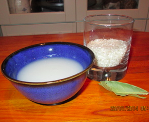 Les proportions sont sur la photo : par personne 1/3 de verre de riz blanc rond type Caroline (très bon marché ) à cuire avec deux verres d’eau, un peu de sel de Guérande et une feuille de laurier pour le goût.